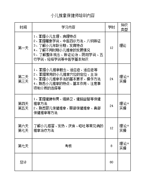 初級(jí)小兒推拿保健師培訓(xùn)時(shí)間為7天,共80學(xué)時(shí),保證學(xué)員學(xué)會(huì)小兒推拿保健基本理論和基本技能,培訓(xùn)合格頒發(fā)烏蘭察布醫(yī)學(xué)高等專科學(xué)校培訓(xùn)合格證書。