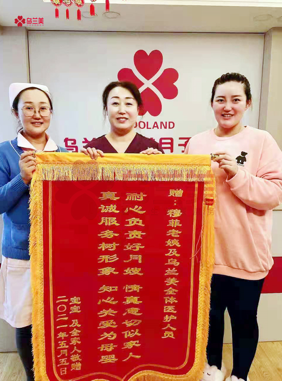 5月5日一大早,烏蘭美醫(yī)養(yǎng)月子中心的每一位母嬰護(hù)理師和工作人員的臉上,都洋溢著幸福的笑容。客戶許娜一家將一面印有“耐心負(fù)責(zé)好月嫂,情真意切似家人,真誠服務(wù)樹形象,知心關(guān)愛為母嬰”的錦旗,親自送到了烏蘭美醫(yī)養(yǎng)月子中心母嬰護(hù)理師穆菲(簡稱,穆姐)手里,以此感謝她對(duì)寶媽和寶寶無微不至的關(guān)懷與照護(hù),并對(duì)烏蘭美健康集團(tuán)的正規(guī)和專業(yè)表示了認(rèn)可!
