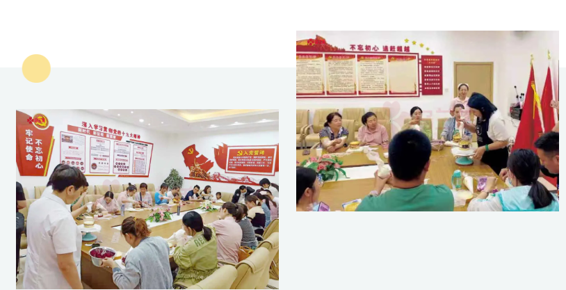 在烘焙師的指導(dǎo)下,大家認(rèn)真學(xué)習(xí)制作蛋糕的技巧——摩拳擦掌,打奶油;躍躍欲試,搓餅干;專心致志,做花邊。大家紛紛自己動手,用打蛋器打出純滑扎實的奶油,裹在蛋糕胚上,涂抹轉(zhuǎn)刮,將切成塊的各種水果一層層疊加,隨后點綴鮮花,一個個色彩斑斕的蛋糕映入眼簾。不少準(zhǔn)媽媽們將愛國主題元素融入到蛋糕中,既體驗到了制作蛋糕的快樂。又激發(fā)身邊人愛黨、愛國的情懷!