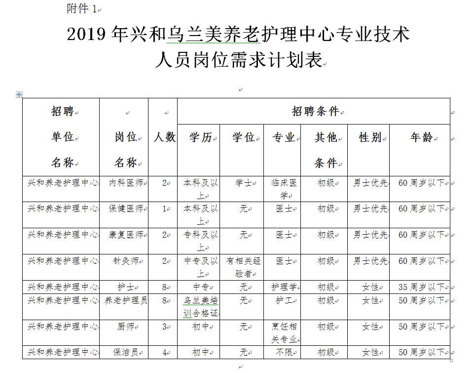 【誠聘英才】烏蘭察布市興和烏蘭美養(yǎng)老護理中心公開招聘30人公告!發(fā)布時間: 2019-05-09 -