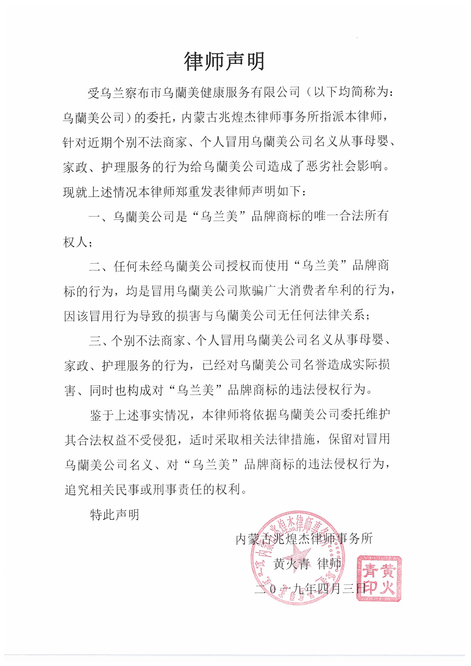 【律師聲明】關于近期出現冒用烏蘭美品牌的律師聲明發(fā)布時間: 2019-04-04 -